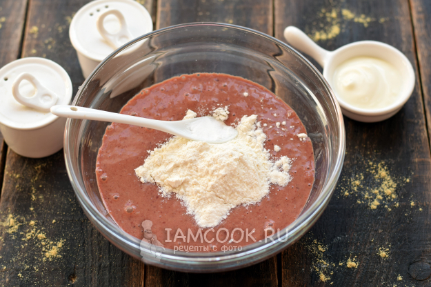 Печеночную смесь перелейте в глубокую емкость, всыпьте пшеничную муку и соду, тщательно перемешайте.