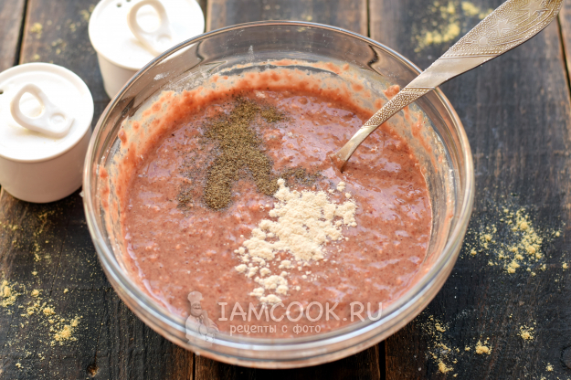 Всыпьте соль, черный перец и молотый чеснок, перемешайте. Дайте массе 10 минут постоять при комнатной температуре.