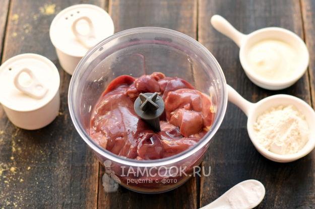 Печень тщательно вымойте, уложите в контейнер блендера к луковому пюре.