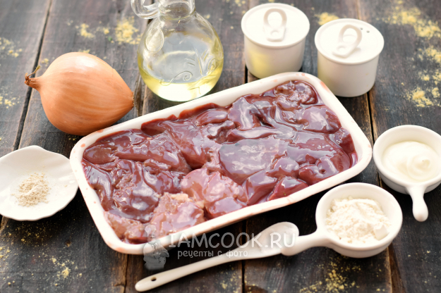 Подготовьте необходимые компоненты для печеночных оладий из куриной печени без яиц.