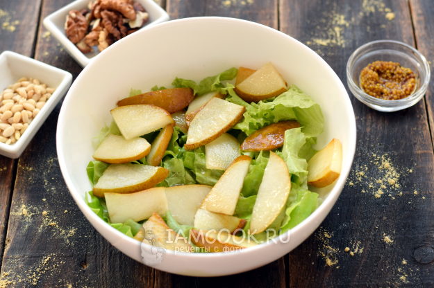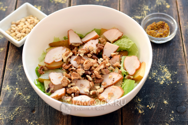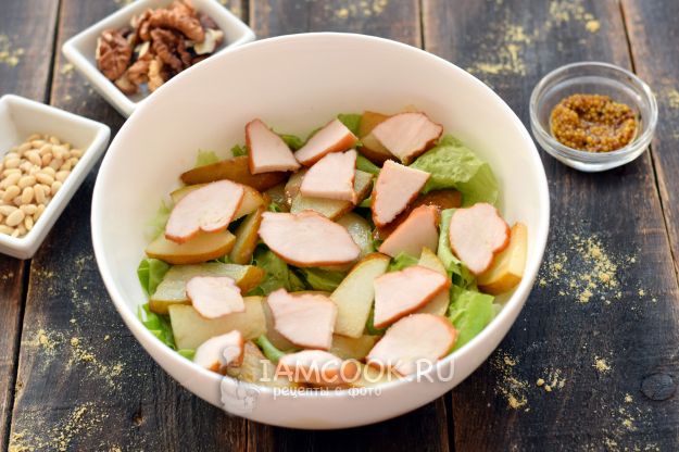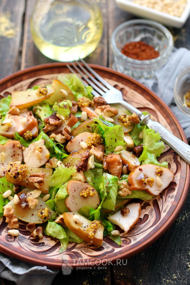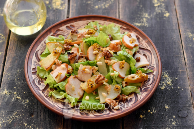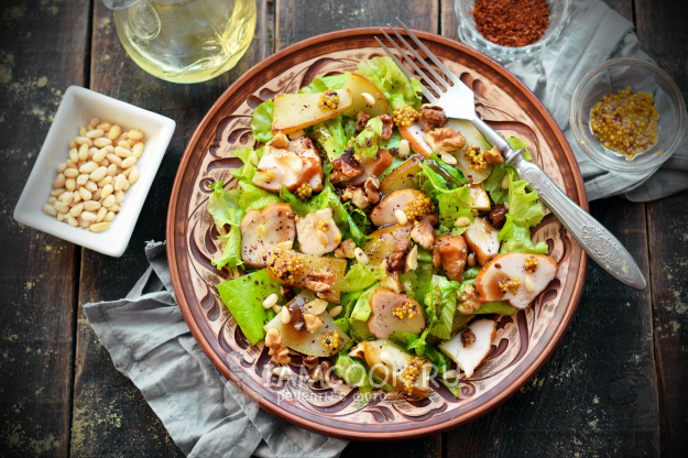 Салат с грушей и копченой курицей готов к подаче на стол.