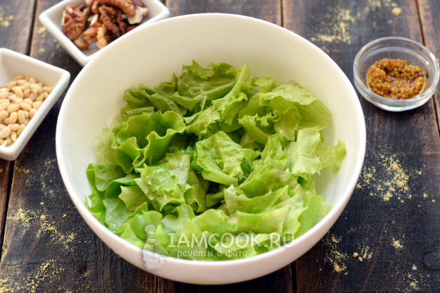 Листья салата ополосните, высушите, порвите руками на крупные части, уложите в салатник.