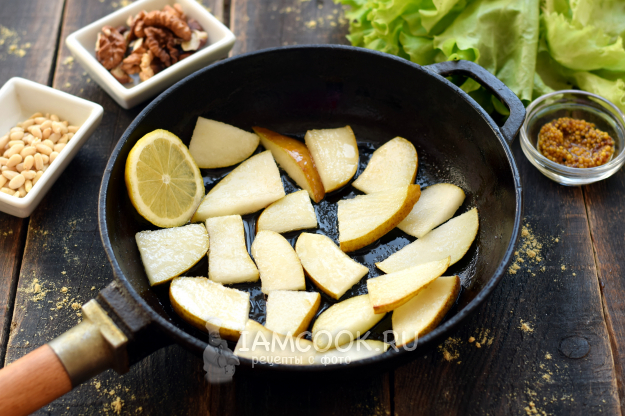 Грушу нарежьте крупными пластинками, кожицу счищать не нужно. Мякоть сбрызните соком лимона, уложите на разогретую сковороду, предварительно смазанную сливочным маслом. Грушу присыпьте сахаром, карамелизируйте кусочки с обеих сторон 5 минут (до мягкости).
