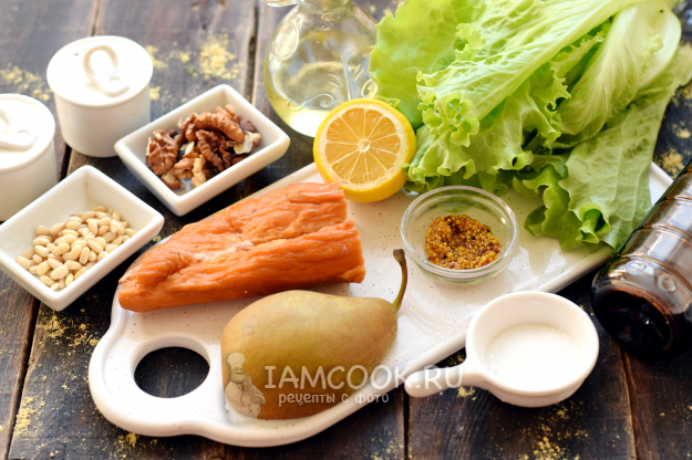 Подготовьте все необходимые продукты для салата с грушей и копченой курицей.