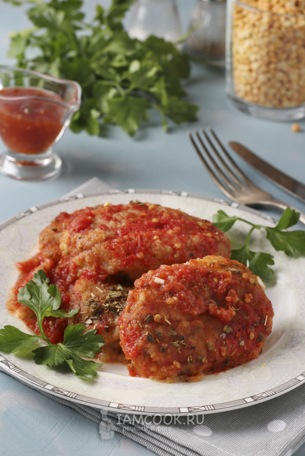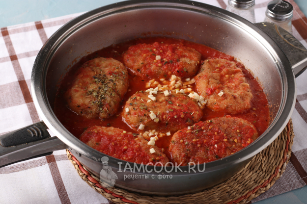 Тушить котлеты в соусе 15 минут. Измельчить чеснок и добавить его в сковороду в самом конце.