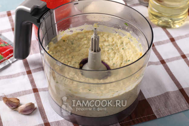 Измельчить все составляющие с помощью насадки "металлический нож" в однородное пюре.