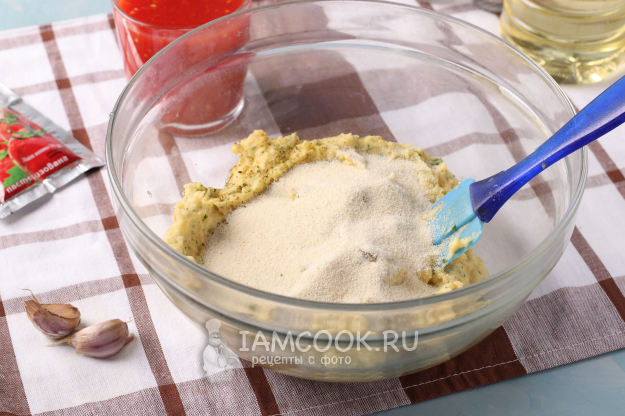 Массу переложить в миску, добавить половину манной крупы, соль и перец. Оставить массу на 15-20 минут.
