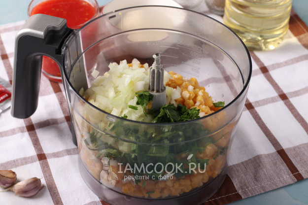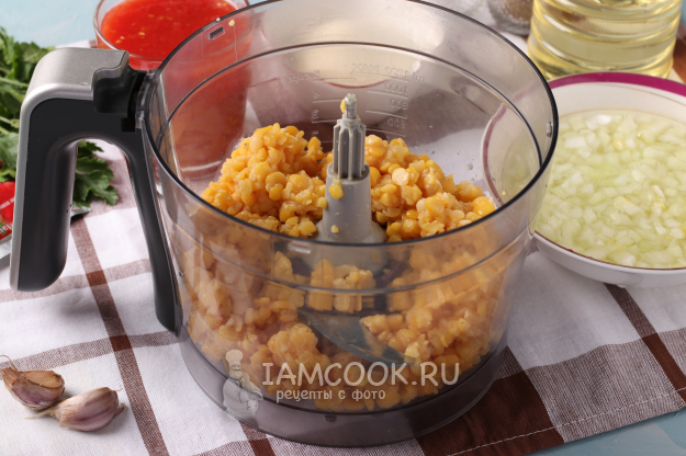Подготовьте ингредиенты для приготовления постных гороховых котлет в томатном соусе.