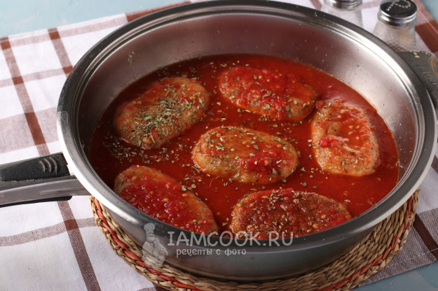 Смешать томатный сок, томатную пасту и пару ложек горохового отвара. Если отвара не осталось, можно добавить воду. Вылить соус на котлеты. Добавить щепотку сахара, соль (если сок несолёный) и прованские травы или другие специи.