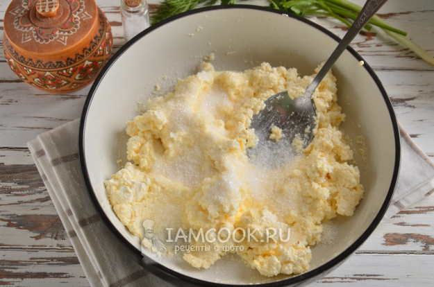Теперь добавьте просеянную пшеничную муку, продолжайте замешивать творожное тесто.