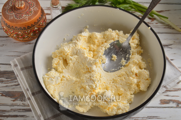 Хорошенько разотрите творог вместе с яйцом. Получится мягкая пластичная масса.
