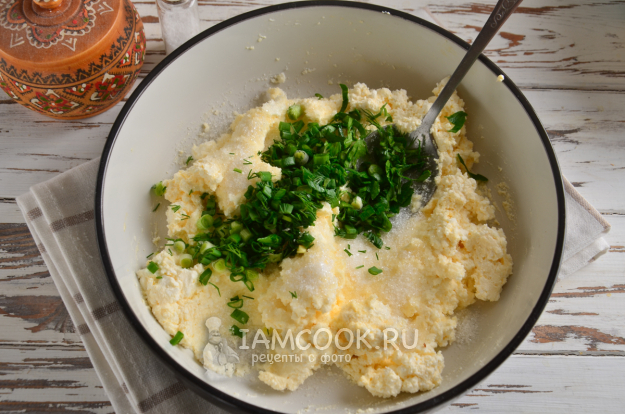 Свежую зелень помойте и обсушите - в рецепте используются укроп, петрушка и зеленый лук. Нарежьте зелень мелко и переложите в миску с творожной массой.