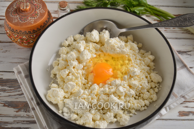 Пересыпьте зернистый творог в миску, туда же вбейте свежее куриное яйцо.