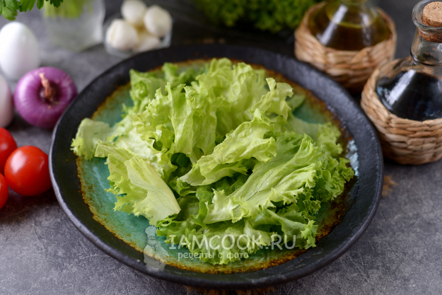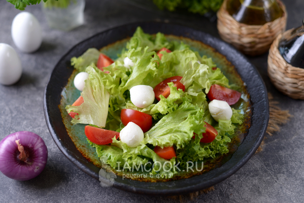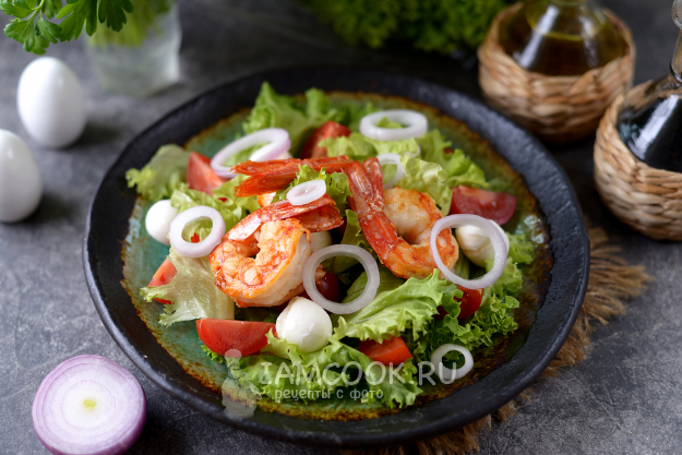 Салат с лангустинами, моцареллой и помидорами черри готов.