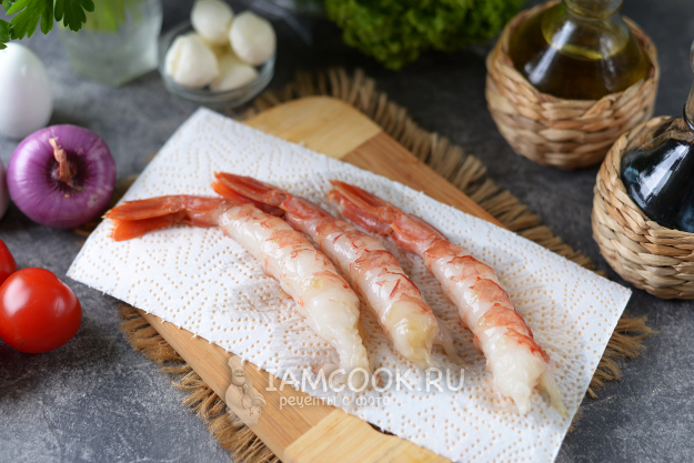 Очистите лангустинов от голов и панциря, удалите кишечник, промойте хвосты, удалите воду бумажными полотенцами. Хвостик панциря можно оставить для красоты.