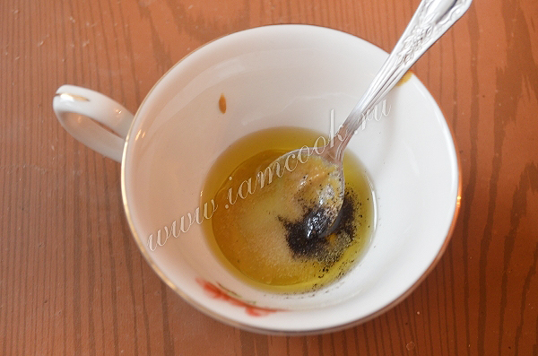 Горчицу перемешать с растительным маслом, солью и перцем.