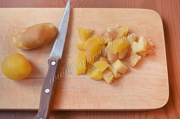 Картофель вымыть, отварить в мундире до готовности. Остудить, очистить, нарезать кубиками.