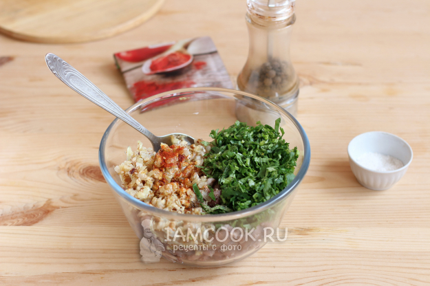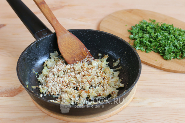 Сразу к обжаренному луку добавим чеснок с кориандром, а также измельченные грецкие орехи, перемешаем, оставим на минимальном огне еще на минуту. Тем временем мелко нашинкуем кинзу.