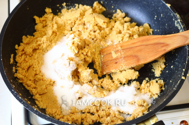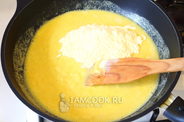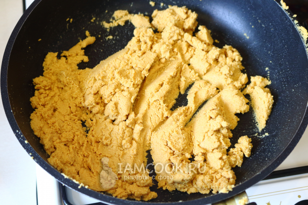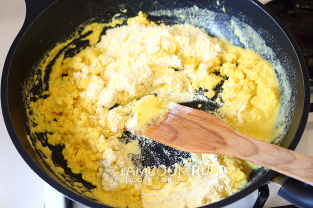 Частями всыпаем муку, мешая содержимое сковороды лопаткой.
