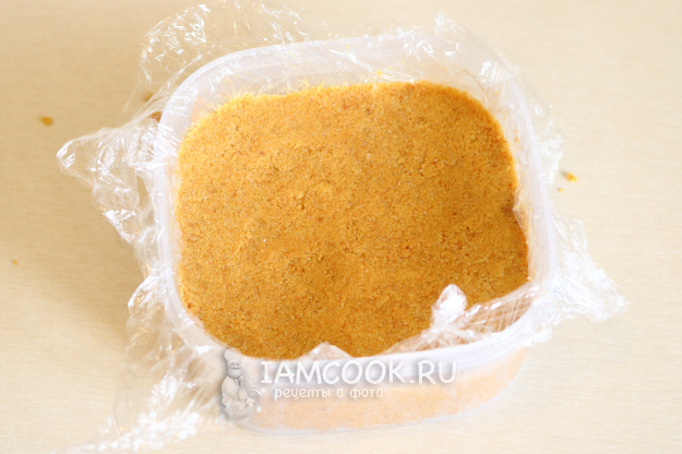 Немного остужаем массу и выкладываем в контейнер. Я на всякий случай его выстелила пищевой плёнкой, но это не обязательно.