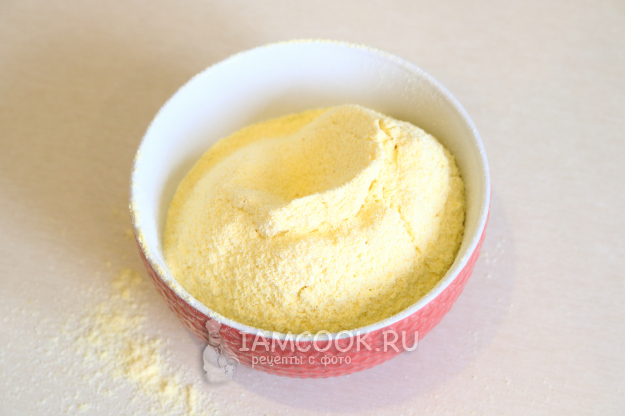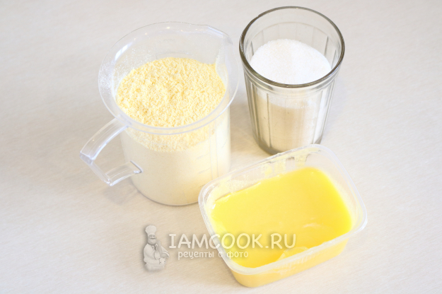 Для приготовления халвы нам потребуются следующие компоненты: мелкая кукурузная мука, топлёное сливочное масло (можно приготовить самостоятельно или купить готовое) и сахар - желательно взять мелкий или смолоть его в блендере самостоятельно, либо же использовать сахарную пудру.