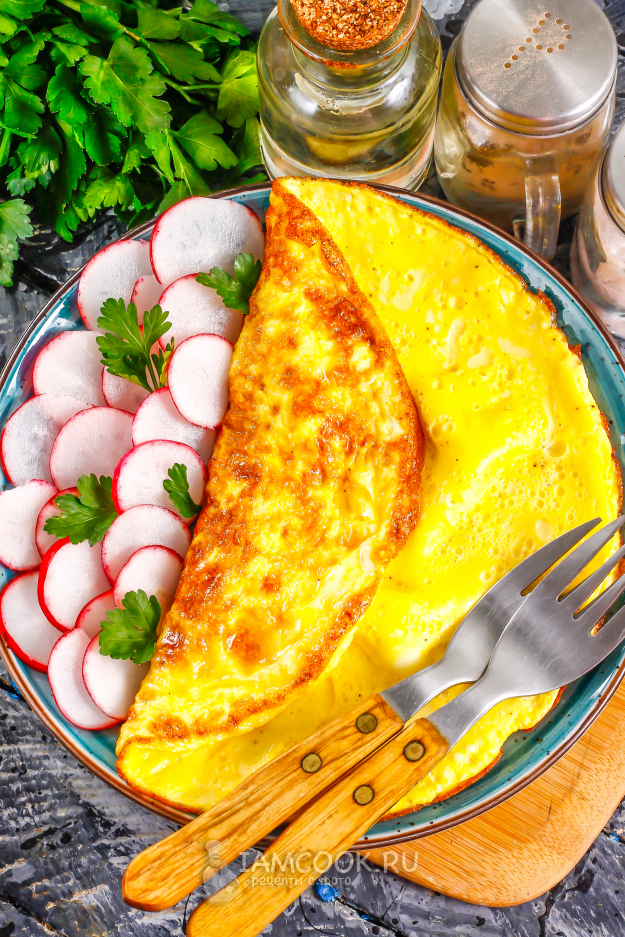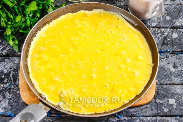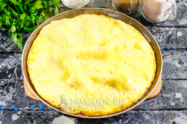 Так как у меня широкая сковорода, то блюдо прожаривается равномерно и мне не нужно накрывать емкость крышкой. Если у вас сковорода с высокими бортиками и она небольшого размера, то обязательно накрывайте ее крышкой или обжаривайте омлет с двух сторон.