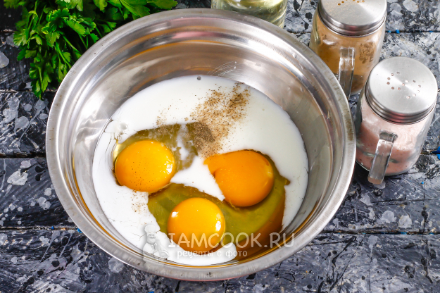 Посолите и поперчите содержимое емкости. Взбейте в течение 2-3 минут, чтобы все равномерно перемешалось.