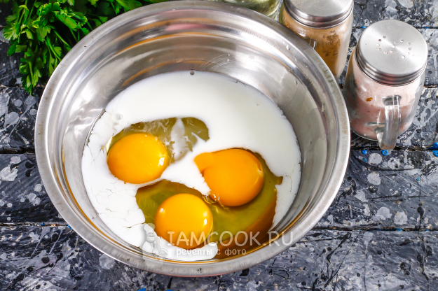 Аккуратно вбейте утиные яйца в глубокую емкость, у них скорлупа более прочная, чем у куриных яиц. Влейте туда же и молоко любой жирности.