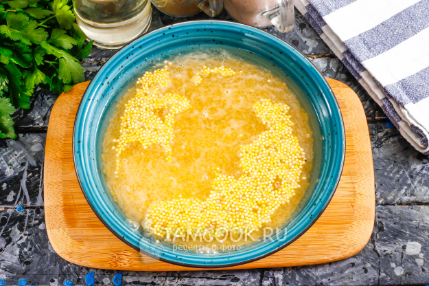 Пересыпьте пшено в кастрюлю или казан, ковш. Влейте теплую воду, всыпьте 2 щепотки соли и отварите кашу в течение 15-20 минут. Затем накройте емкость крышкой и дайте блюду пропариться еще 5 минут. Если мясной фарш не жирный, то можно добавить в кашу немного сливочного масла и перемешать.