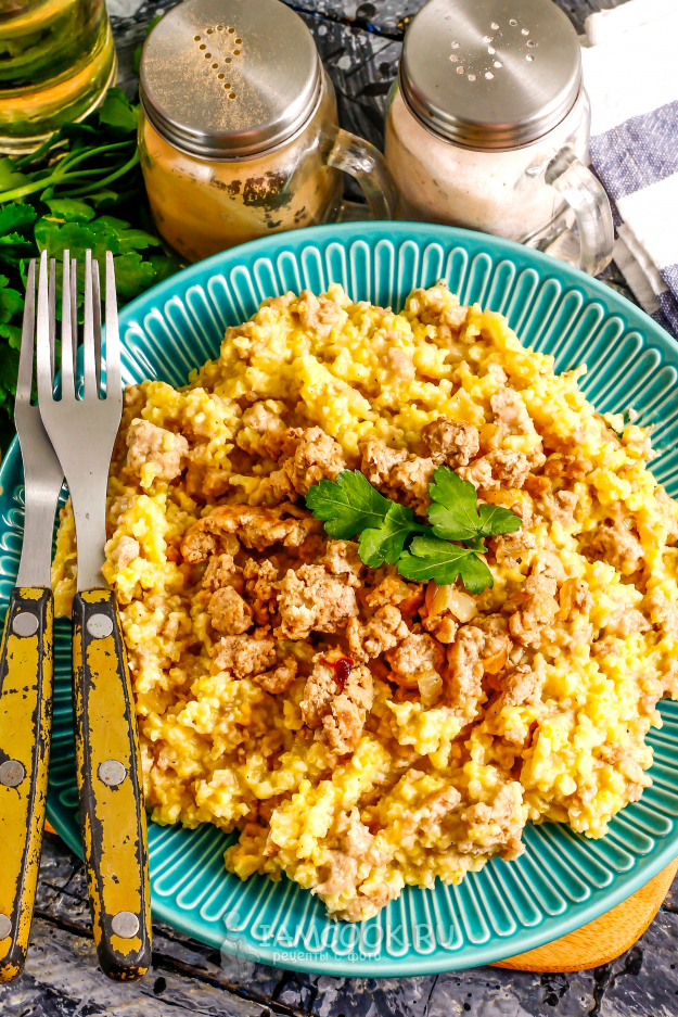 Подайте пшенную кашу с фаршем к столу горячей, выложив ее на тарелки.
