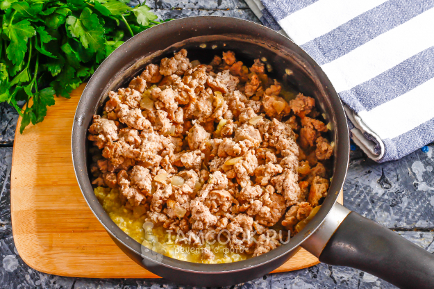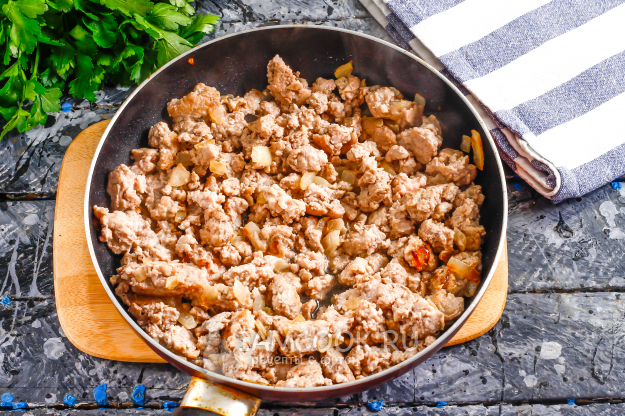Выложите мясной фарш и обжарьте еще 6-8 минут, пока он полностью не приготовится. Не забывайте перемешивать содержимое емкости.