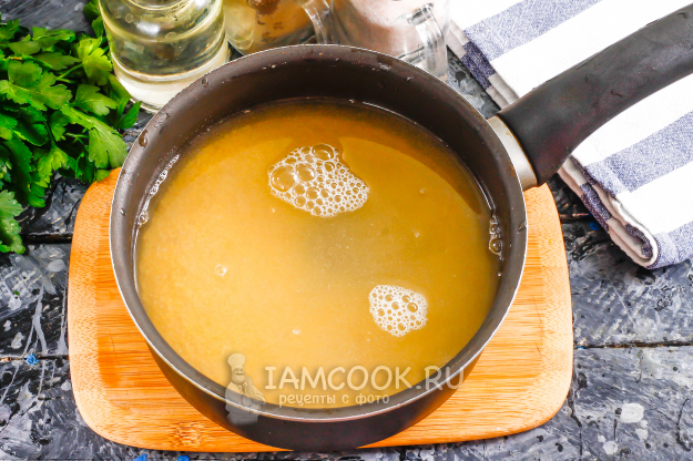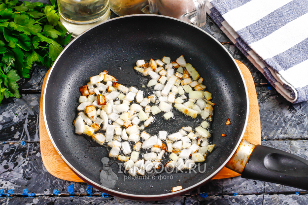 В это время очистите репчатый лук, промойте и нарежьте кубиками. Обжарьте луковую нарезку на растительном масле до румяности.