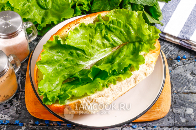 Промойте листья салата, слегка обсушите их бумажными салфетками и выложите внутрь сайки. Можно заменить листовой салат другими видами салата, шпинатом, рукколой и т.д.