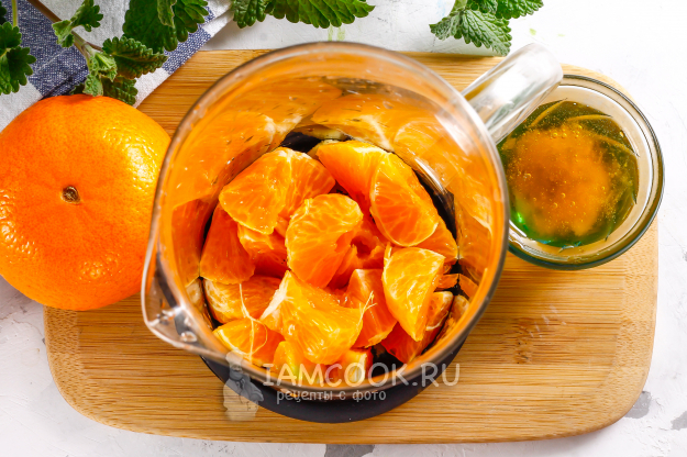 Мандарин очистите от кожуры, тщательно удалите белый слой и разделите плод на дольки. Удалите из долек косточки, если таковые присутствуют. Разрежьте на кусочки и добавьте в емкость.