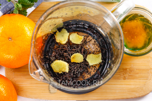 Всыпьте в заварник черный чай (я использую крупнолистовой). Очистите часть корня имбиря, промойте и нарежьте в емкость слайсами. Можно натереть его на терке с мелкими ячейками. Много имбиря не добавляйте, так как напиток будет горчить!