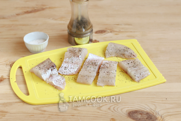 Сбрызнем лимонным соком кусочки рыбы, приправим каждый кусочек солью и молотым перцем по своему вкусу.