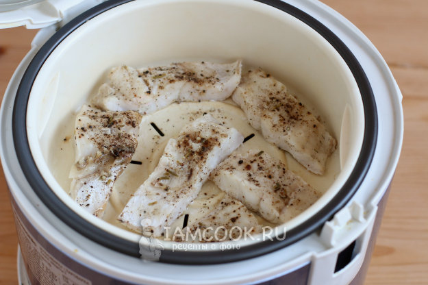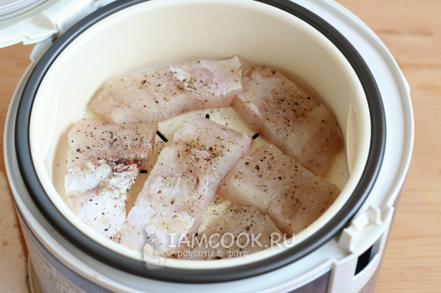 Поверх большой чаши установим чашу для продуктов и разложим кусочки судака. Закроем крышку и включим программу Варка на пару. Установим время 17 минут.
