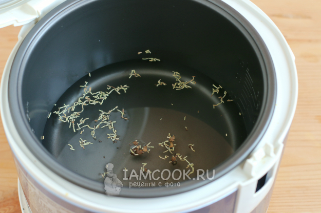 В чашу мультиварки нальем воду, всыплем сушеный розмарин (он придаст рыбе аромат), а также две горошины душистого перца, только их обязательно следует раздавить ножом, чтобы они лучше отдали свой аромат.