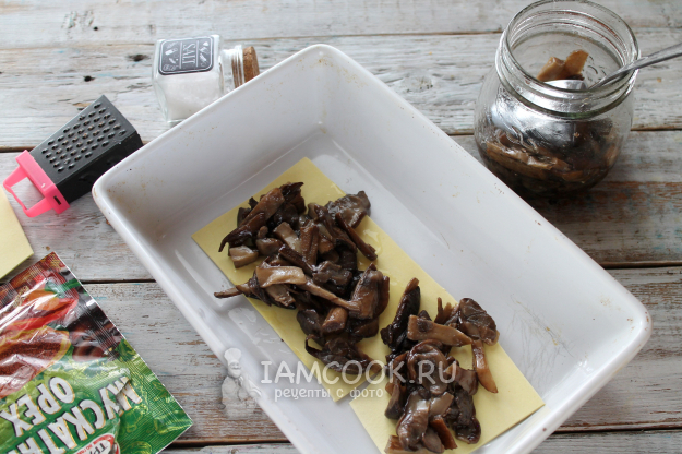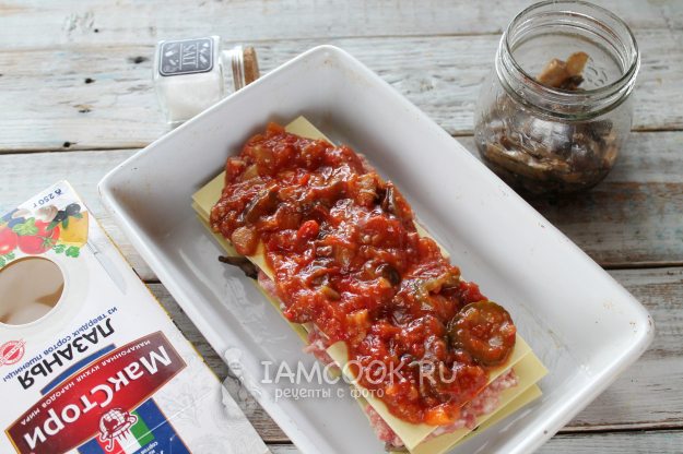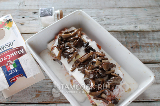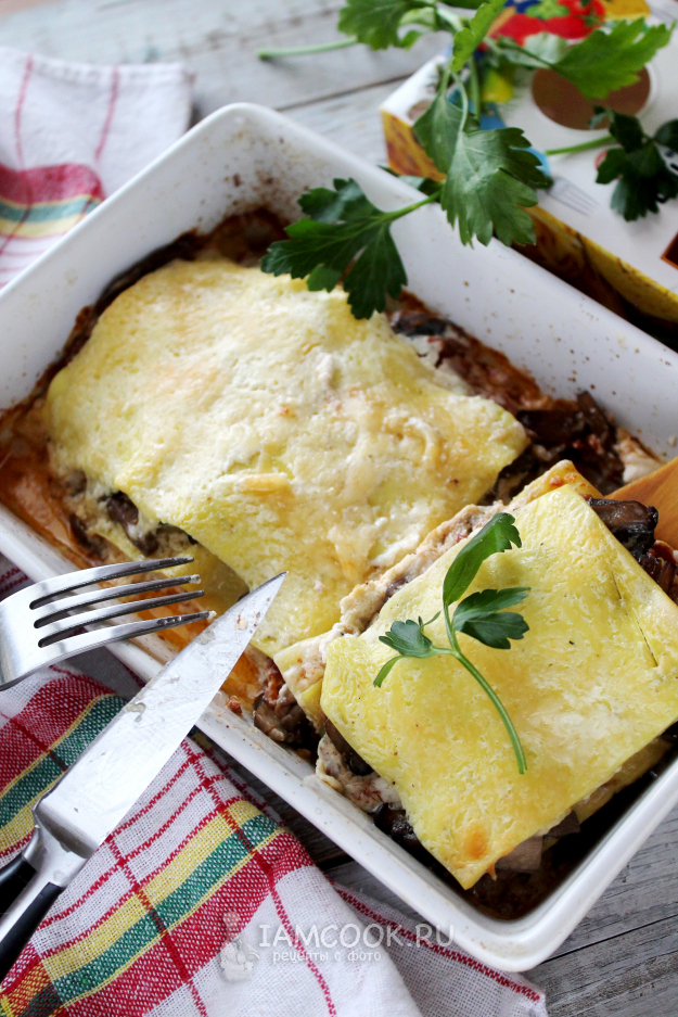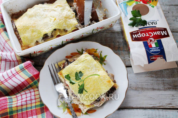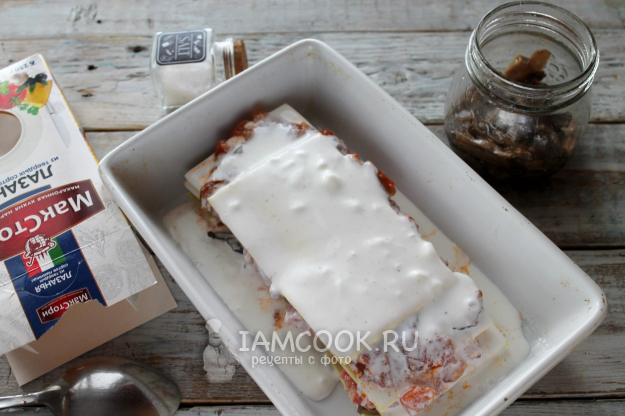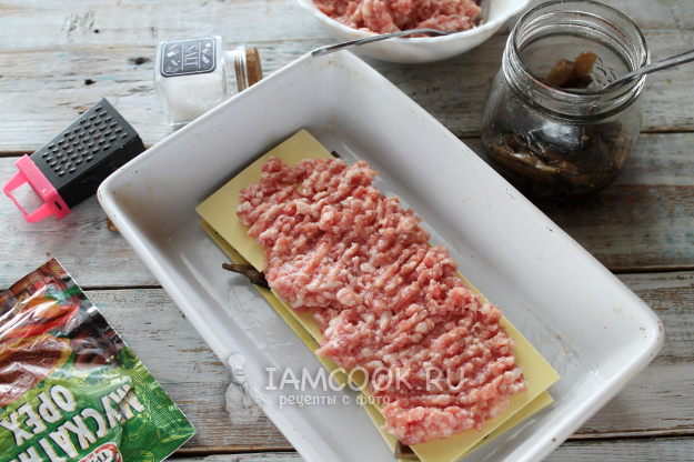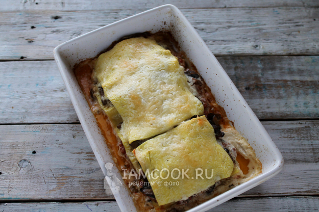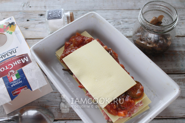 Снова листы пасты и слой мясного фарша (или снова грибы, если не берете мясо).