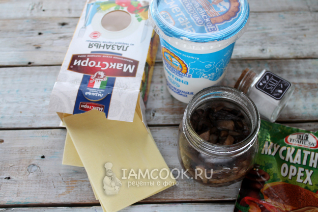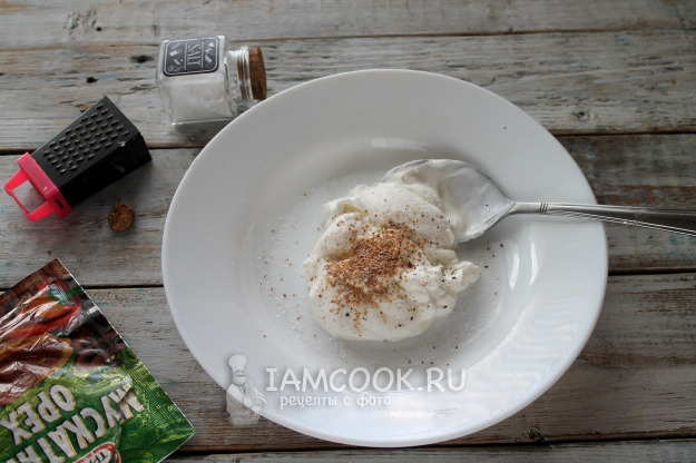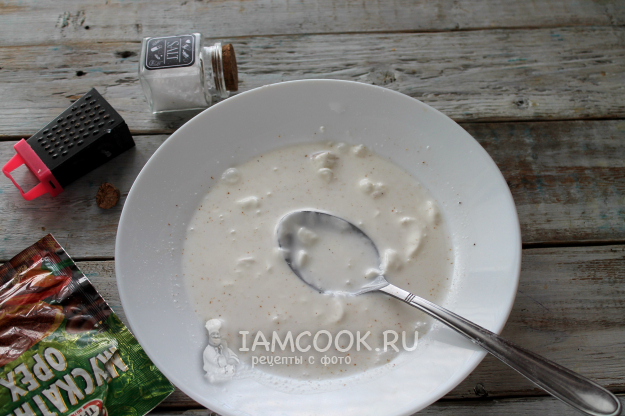 В густую сметану добавьте соль и молотый мускатный орех. Хорошо если вы натрете настоящий орешек, но порошок тоже подойдет.