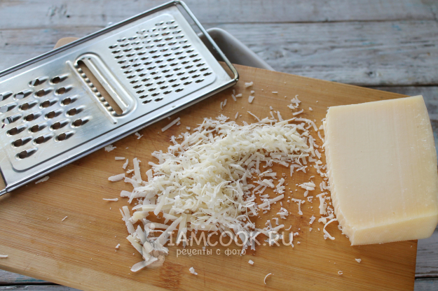 На мелкой терке натрите пармезан (или другой твердый пикантный сыр).