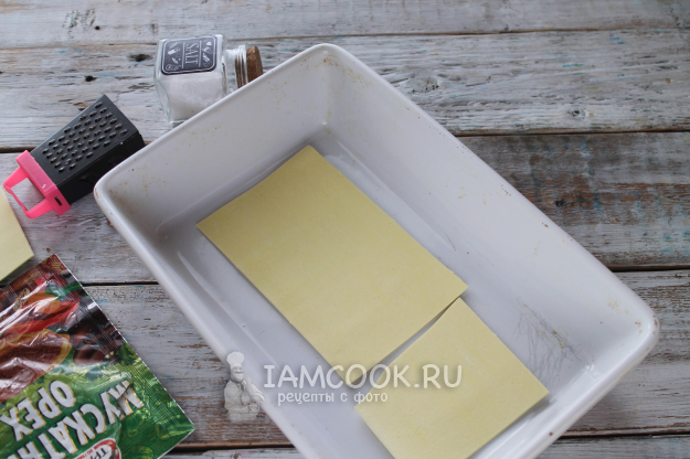 Смажьте соусом низ формы для запекания и выложите первый слой листов для лазаньи.