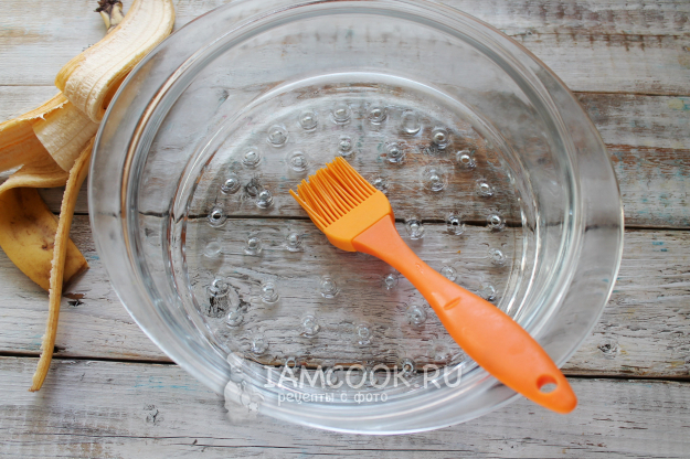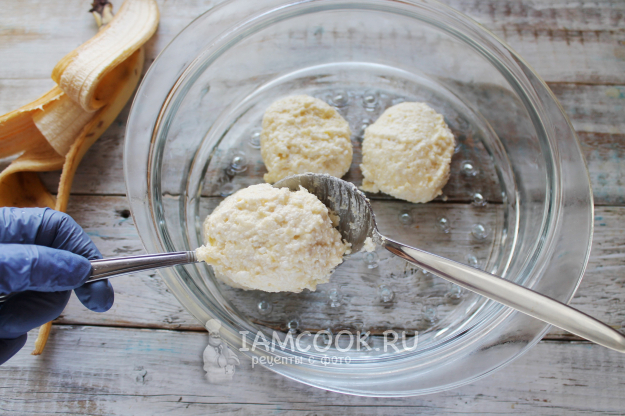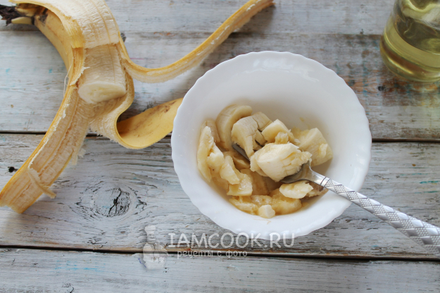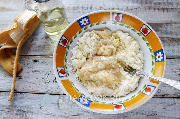 Добавьте банан в творожную массу, влейте масло и хорошо вымесите - до однородности. Дайте постоять, как любому тесту.