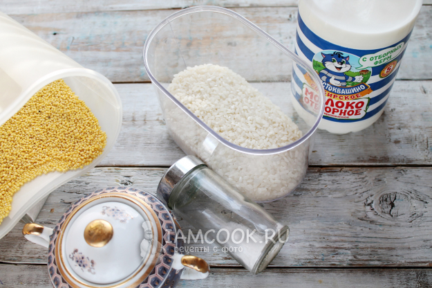 Возьмите продукты для приготовления каши «Дружба» в микроволновке. В классический вариант каши принято брать пшенную и рисовую крупы в равном соотношении.