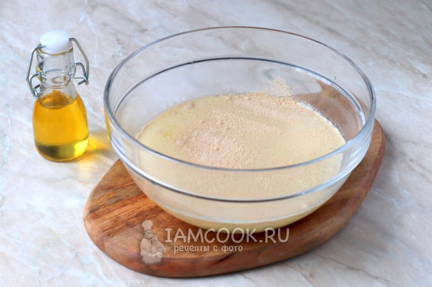В тёплой сыворотке растворите сахарный песок и добавьте сухие дрожжи. Перемешайте и оставьте массу на 15 минут при комнатной температуре. За это время дрожжи "оживут", поднявшись над жидкостью пышной шапочкой.