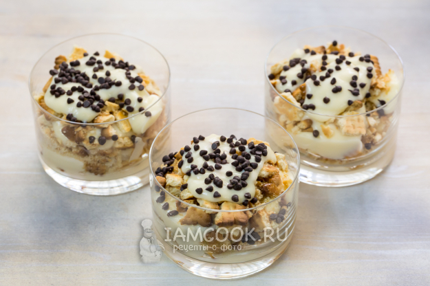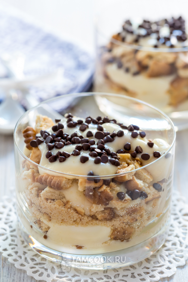 Для приготовления десерта из печенья с заварным кремом подготовьте продукты по списку.