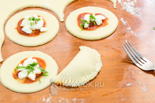 Из кружочка сформируйте "чебурек", края крепко прижмите и пройдитесь вилкой.