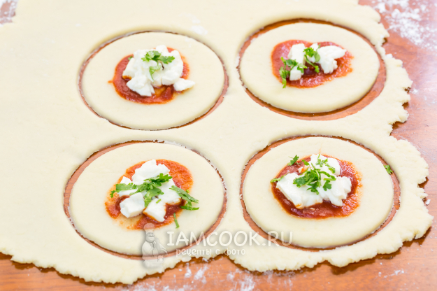 Каждый кружочек смажьте 1 ч.л. томатного соуса. Выложите раскрошенный или мелко нарезанный сыр и несколько нарезанных мелко листиков кинзы.