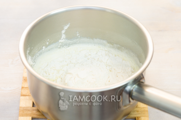 Снимите ковш, добавьте муку и сразу же перемешайте, чтобы не было комочков. Тесто соберется в комок.