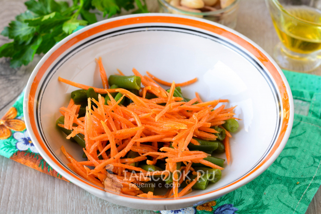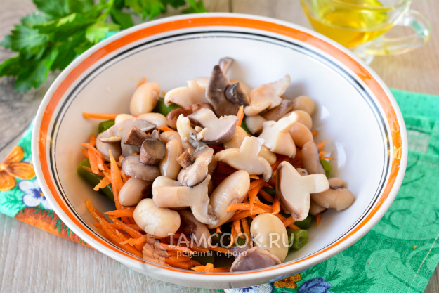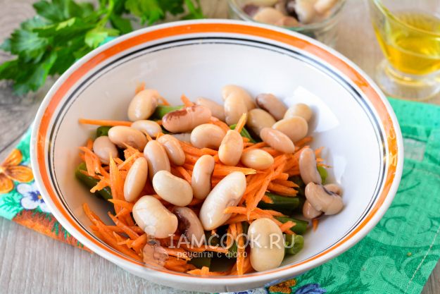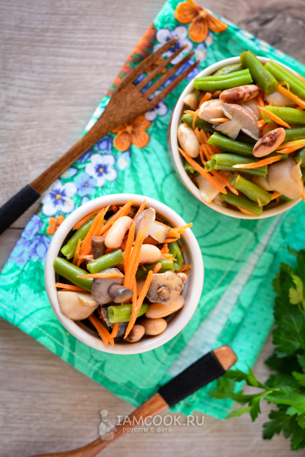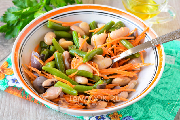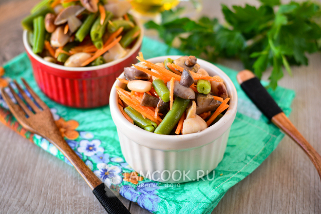 Салат с двумя видами фасоли, маринованными грибами и корейской морковью готов, подавайте его к столу. Приятного аппетита!